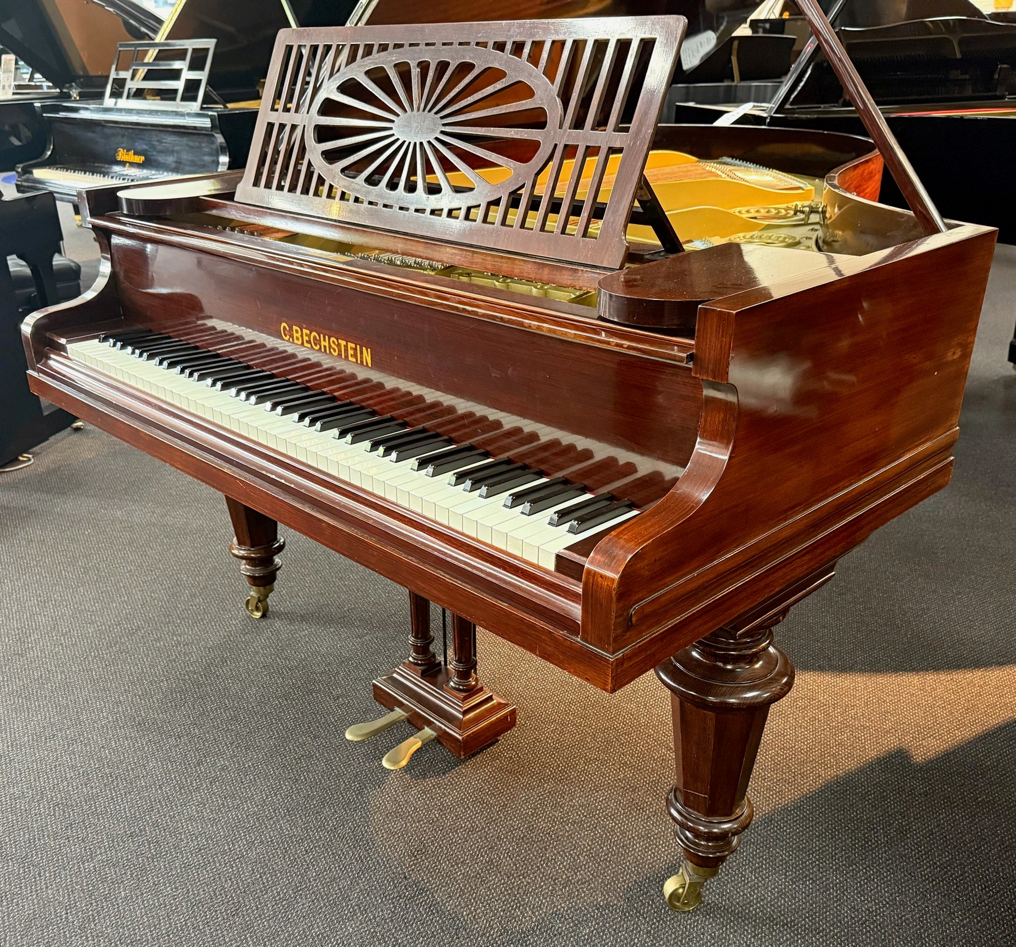 The piano is presented in a magnificent rosewood cabinet featuring elegant turned legs and a finely hand-carved music desk, reflecting the superb cabinet making typical of early 20th-century Bechstein grands.