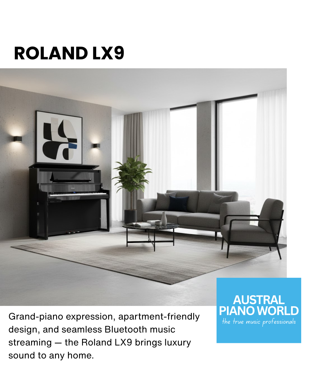 The LX9 features a modern design with high-gloss and non-polished finishes in polished white, polished ebony, or charcoal black. The maintenance-free build ensures long-term reliability with no tuning required.